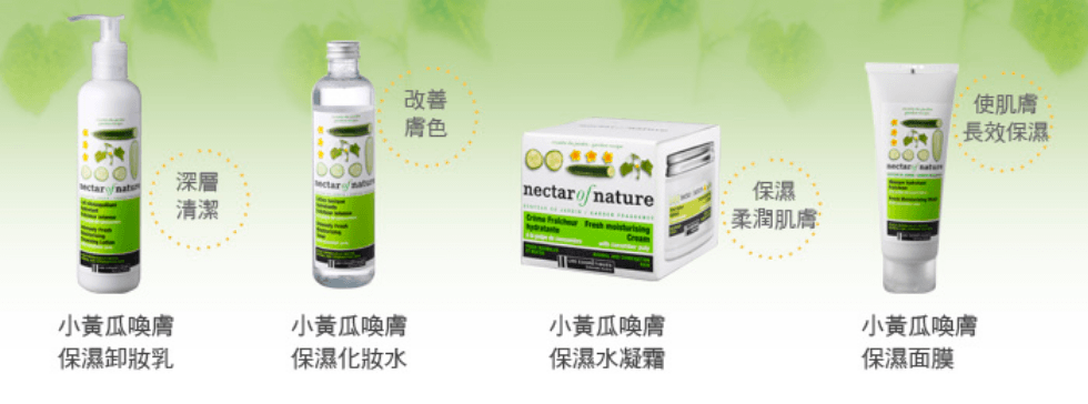 nectar of nature專家團隊推出全新系列產品,針對一般與混合性肌膚保濕問題,提出解決方案。透過 一系列臉部保養產品,揭露了小黃瓜的保濕秘方-保濕、清爽、柔嫩與潔淨,小黃瓜就是肌膚鎖水、清爽與柔嫩的最佳選擇。